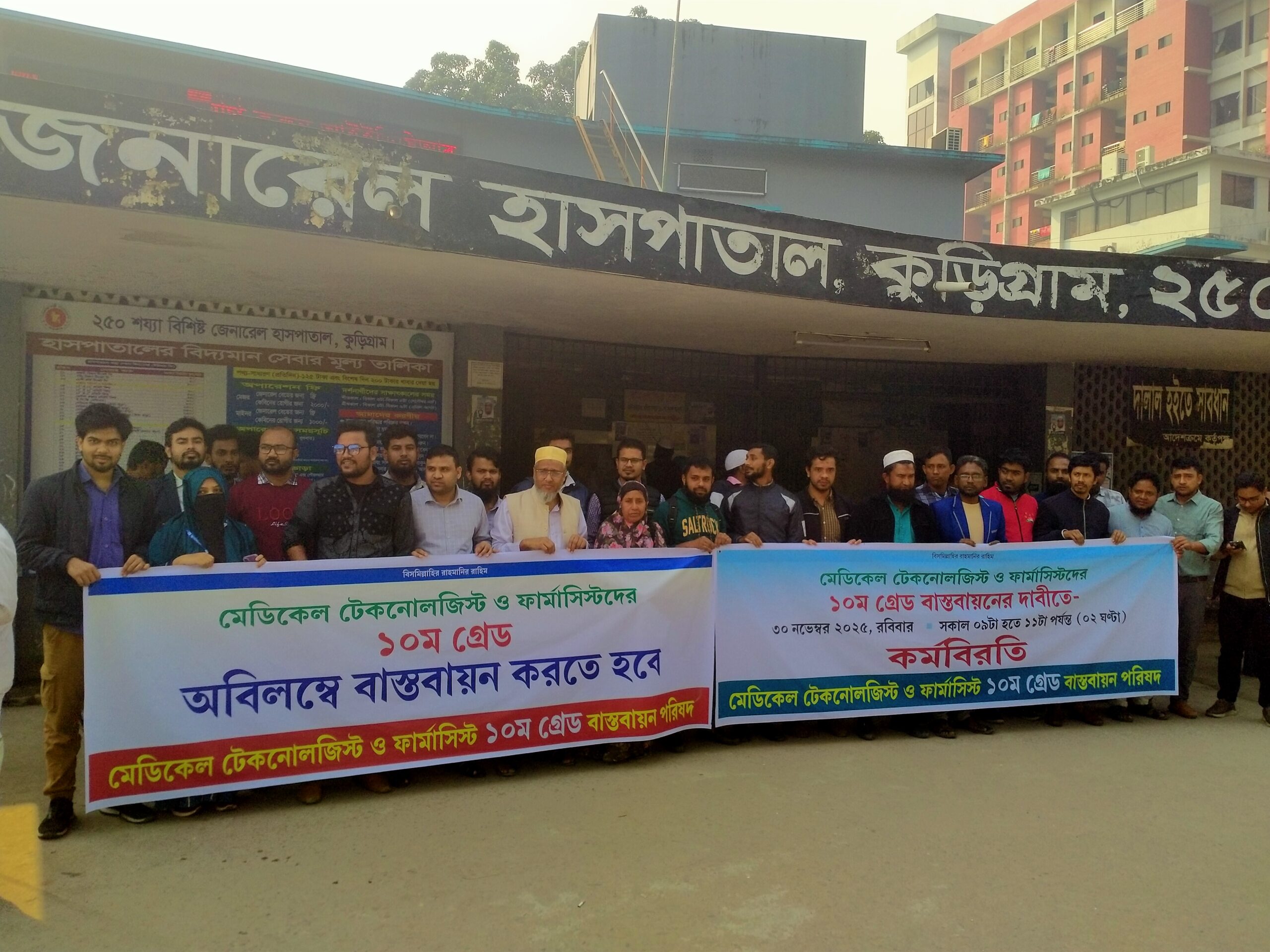 ১০ম গ্রেডের দাবিতে কুড়িগ্রামে মেডিকেল টেকনোলজিস্ট ও ডিপ্লোমা ফার্মাসিস্টদের কর্মবিরতি
