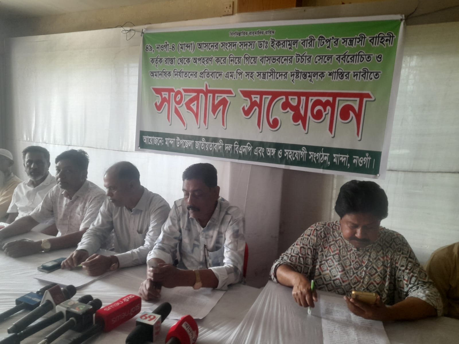 নওগাঁর মান্দায় নিজ দলীয় নেতাকর্মী ও সাধারণ মানুষকে উঠায় নিয়ে গিয়ে মান্দা-৪ আসনের এমপি ইকরামুল বারী টিপুর টর্চারসেলে নির্যাতন করার প্রতিবাদে সংবাদ সম্মেলন অনুষ্ঠিত হয়েছে। সোমবার দুপুরে মান্দা উপজেলা বিএনপির আয়োজনে নওগাঁ কমিউনিটি সেন্টারে সংবাদ সম্মেলনে প্রধান অতিথি হিসাবে উপস্থিত ছিলেন মান্দা উপজেলা বিএনপির সাধারণ সম্পাদক শফিকুল ইসলাম, বিশেষ অতিথি হিসাবে উপস্থিত ছিলেন মান্দা উপজেলা বিএনপির যুগ্ন সা: সম্পাদক বেলাল হোসেন । সংবাদ সম্মেলন শফিকুল ইসলাম বলেন খাসজমি দখল চাঁদাবাজি খাসপুকুর অর্থের বিনিময়ে বন্টন করার প্রতিবাদ করায় আমাদের নেতাকর্মী ও সাধারণ মানুষকে এমপির গুন্ডা বাহিনী তুলে নিয়ে গিয়ে তার বাড়ির আন্ডার গ্রাউন্ড টর্চারসেলে দেশীয় অস্ত্র দিয়ে মারধর করে।আমাদের সংগঠনের দপ্তর সম্পাদক আবুল কালাম আজাদ নির্যাতনের শিকার হয়ে এখনো নওগাঁ সরকারি হাসপাতালে ভর্তি আছে এছাড়াও সাংগঠনিক সম্পাদক শামসুল ইসলাম বাদল এর উপর হামলা চালানো হয়। আমরা এর সুষ্ঠু তদন্ত সাপেক্ষে দলের চেয়ারম্যান তারেক রহমানের কাছে বিচার দাবি করছি। এসময় ভিডিও কলে সংবাদ সম্মেলন যোগ দিয়ে মান্দা উপজেলা বিএনপির সভাপতি আবদুল মতিন বলেন আমাদেও দলের সভাপতি সেক্রেটারী সাথে কোন সমন্বয় করেনা উল্টো নেতা কর্মীদেও নির্যাতন করা হচ্ছে যা মোটেই কাম্য নয়।ভুক্তভুগি দপ্তর সম্পাদক আবুল কালাম আজাদ বলেন আমি বর্তমানে নওগাঁ সরকারী হাসপাতালে আছি আমাকে এমপির এপিএস মোহাম্মদ আলী সহ কয়েকজন প্রসাদপুর জনতা ব্যাংকের সামনে থেকে টেনেহেছড়ে এমপির বাসার টর্চারসেলে নির্মমভাবে নির্যাতন করে। সংবাদ সম্মেলন অন্যান্যদের মধ্যে উপস্থিত ছিলেন মান্দা উপজেলা বিএনপির সাংগঠনিক সম্পাদক সামসুল ইসলাম বাদল,এ্যাডভোকেট কুমার বিশ্বজিত,পরানপুর ইউপি সভাপতি গোলাম মোস্তফা, প্রসাদপুর ইউপি সেক্রেটারী গোলাম হোসেন খান, ভারশো ইউপি সভাপতি গোলাম নবি কাবুল,সহ সভাপতি মোহাম্মদ আলীসহ ১৪ টি ইউনিয়ন বিএনপির সভাপতি সেক্রেটারী ও নেতাকর্মী গন।