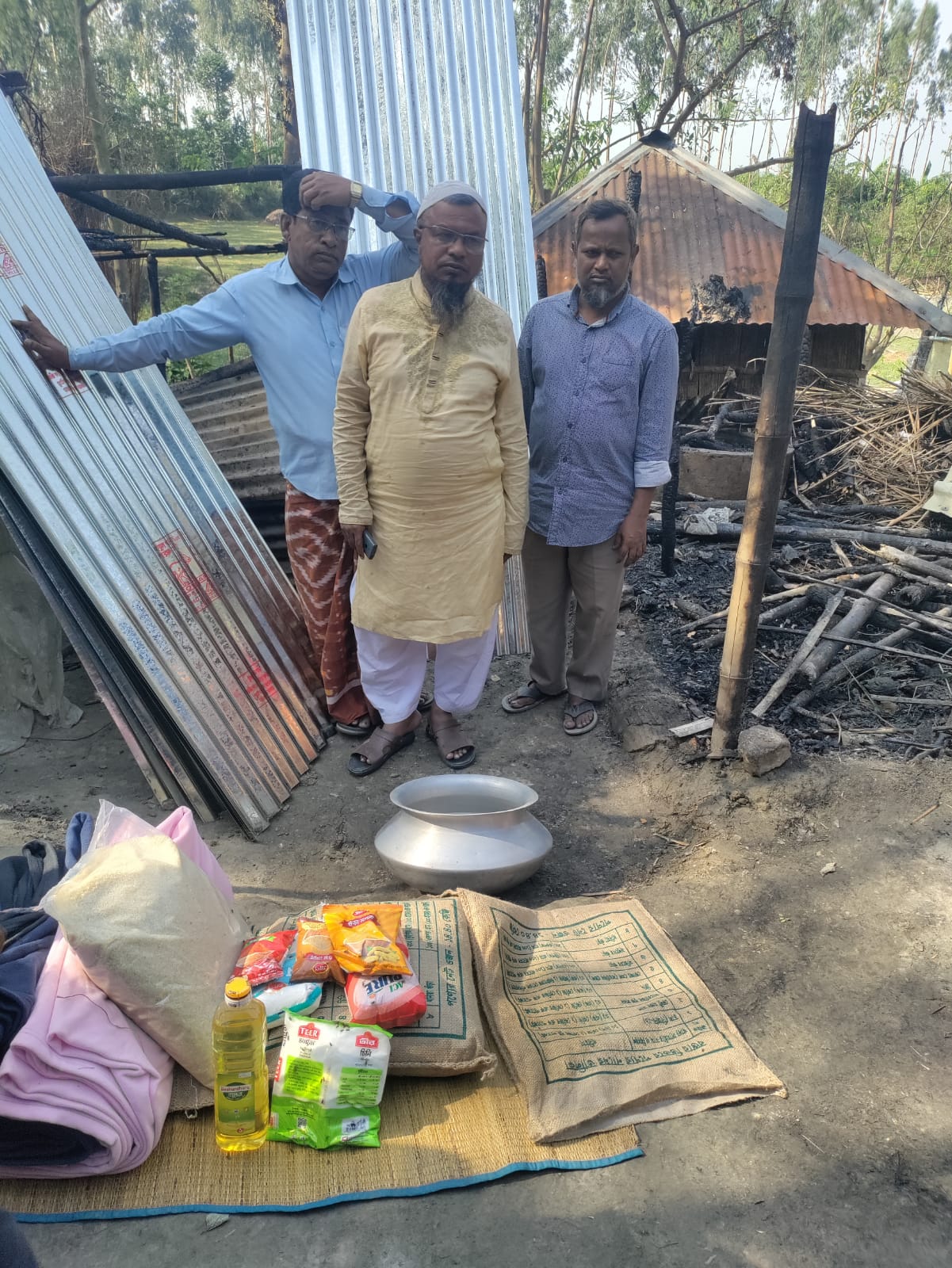 পলাশ জানান তাদের বাড়িটি হচ্ছে বাঁশ ও বনের বেড়ার উপর টিনের ছাউনি দিয়ে তৈরি। গতকাল শুক্রবার রাতে গোয়াল ঘরে কয়েল দেওয়া ছিলো। মধ্যরাতে পলাশের মা আগুনে বাঁশ পোড়ার শব্দ শুনতে পান। এরপর দেখতে পান তাদের বাড়ি আগুনে পুড়ছে। মুহূর্ত্বের মধ্যে আগুন ছড়িয়ে পড়ে অন্যান্য ঘরেও। এসময় তার অসুস্থ্য বাবাকে ঘর থেকে বের করার সময় শরীরের কয়েকটি স্থানে আগুনে পুড়ে যায়। সঙ্গে তার মায়ের কপালেও আগুন পড়লে পুড়ে যায়। এছাড়া গোয়াল ঘরে থাকা ৮-১০টি ছাগলের মধ্যে ৪টি ছাগল ও কয়েকটি বাচ্চা আগুনে পুড়ে মারা গেছে। আগুনে আহত হওয়া অন্যান্য ছাগলগুলোর অবস্থাও আশঙ্কাজনক। আগুনে তাদের দুটি ঘর, একটি রান্না ঘর ও একটি গোয়াল ঘর পুরোপুরি পুড়ে গেছে। ধারণা করা হচ্ছে কয়েলের আগুন থেকে এমন অগ্নিকাণ্ডের সৃষ্টি হয়েছে। আগুনে সব হারিয়ে বর্তমানে তারা নি:স্ব। কিভাবে তাদের সংসার চলবে? কিভাবে তার বাবা ও মায়ের চিকিৎসার খরচ যোগার করবে এমন চিন্তায় দিশেহারা পলাশ। তাই তিনি সরকারের সহযোগিতার পাশাপাশি সমাজের বিত্তবানদের কাছে সার্বিক সহযোগিতা কামনা করেছেন পলাশ।